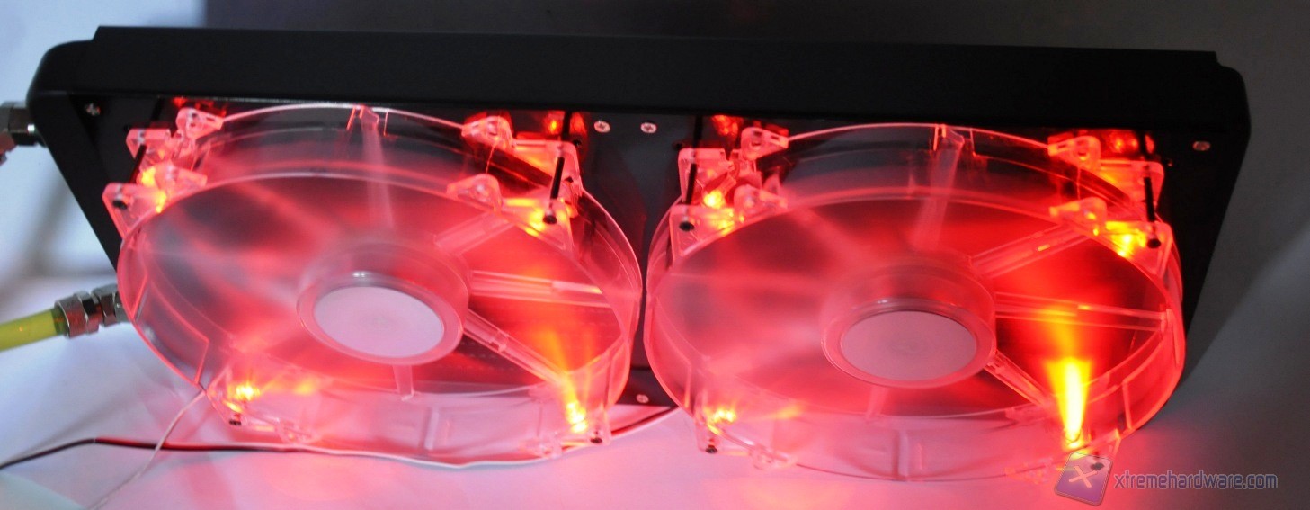 Le ventole scelte per i test sono quelle della Coolermaster che hanno in dotazione i led rossi (ma sono presenti in vendita anche con led blu) e creano un piacevole effetto ottico che risalta maggiormente nella foto di destra scattata senza il flash. Dalle specifiche tecniche il range di compatibilità del radiatore nella scelta delle ventole è molto ampio, si possono difatti utilizzare anche ventole di diametro da 180mm.