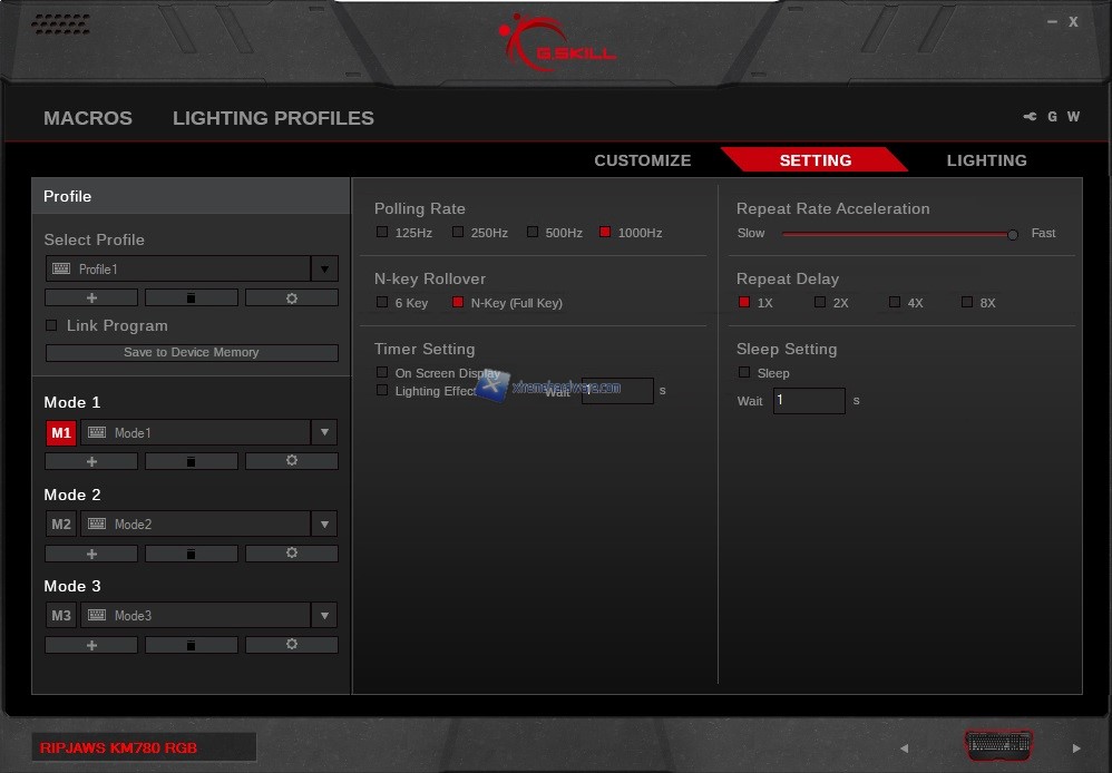 A seguire passiamo al Menù ‘’Settings’’ dal quale potremo impostare e regolare Polling Rate, passare da una modalità di Anti-ghosting 6KRO o NKRO o ancora sul Timer di cui abbiamo un tasto dedicato o al tempo di ritardo della pressione tasti.
