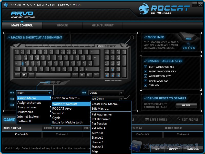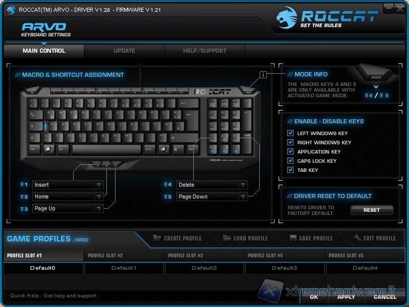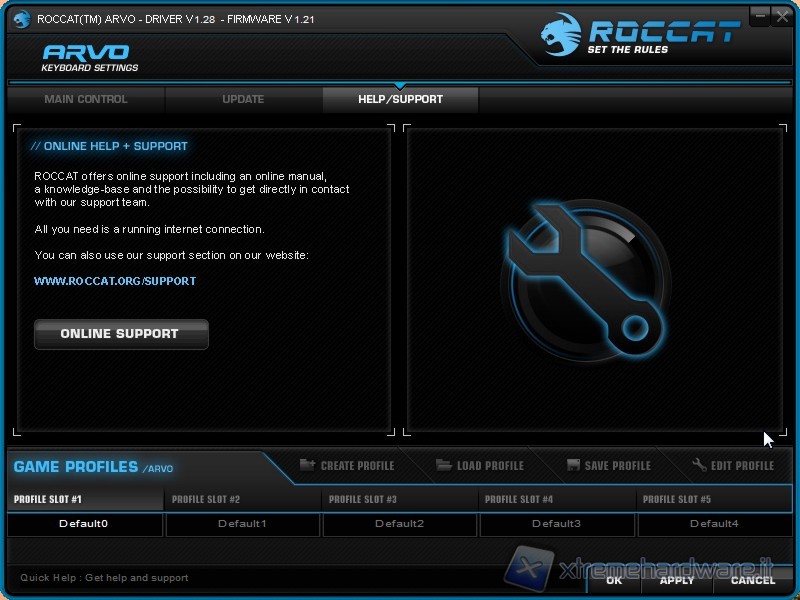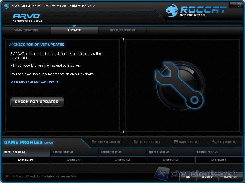 Il programma Roccat in dotazione, oltre all'installazione dei driver, ci permette di configurare i 5 tasti macro presenti sulla tastiera. Possiamo salvare sino a 4 profili per poi caricarli al momento opportuno quando necessario. Inoltre è presente una pagina dedicata all'update e una al supporto tecnico.